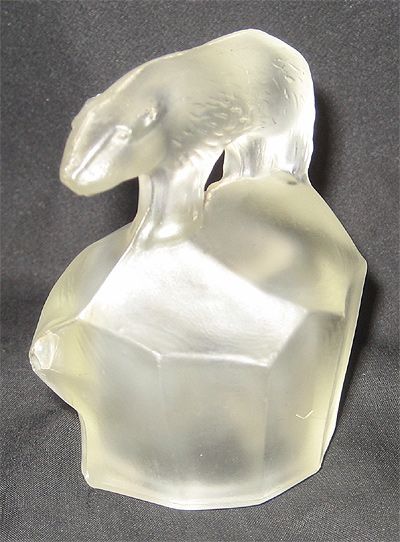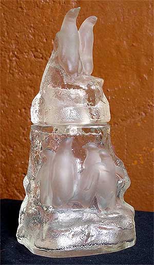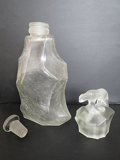 Description of the objects: The Crackle Crystal bottle look like an iceberg with a Polar Bear on the top. Glass ground-in stopper is covered by glass cap like a figure of a Polar (White, Northern) Bear standing on the top of ice block. There are elements of Label